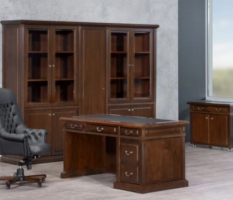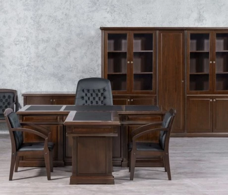Выбор был сделан в пользу шпонированной мебели темных оттенков, имеющейся в складской программе. Две разные серии WASHINGTON и Sorbonne полностью соответствуют друг другу по цветовой палитре. Это позволило выполнить все работы в установленный заказчиком срок. Благодаря использованию столов, шпонированных МДФ, с включениями рециклированной кожи и толщине столешниц 46 мм, удалось получить кабинеты представительского класса.